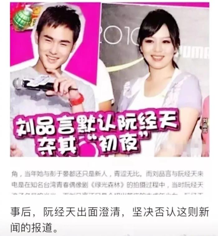 与此同时,坊间传出了阮经天在聚会中炫耀自己是刘品言的第一个男人。