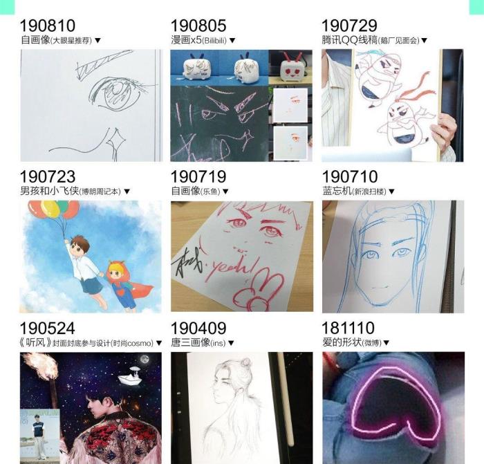 不仅如此,出道后肖战也经常在社交软件上晒出自己亲手画的绘画,比如前段时间端午节的十只粽子还有疫情期间为祖国加油打气的绘画等还有很多。肖战笔下的每一幅画都十分生动富有意境,经常有网友调侃这是一个“被演戏耽误的设计师”。