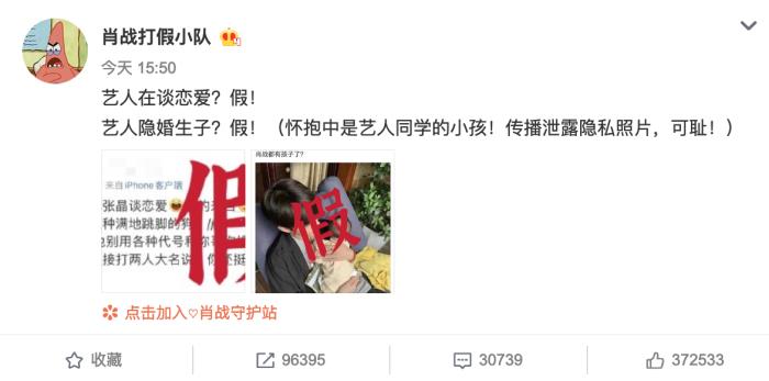 7月26日,肖战因网络上传出怀抱婴儿的照片,被网友猜测其隐婚生子。随后,肖战方发文否认该传闻:“艺人在谈恋爱?假!艺人隐婚生子?假!”并解释了肖战怀中抱着的其实是艺人同学的小孩,同时对传播泄露肖战隐私照片的行为进行谴责。
