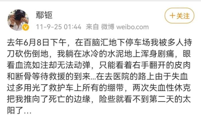 2010年6月8日,在北京蓝岛大厦旁边的某地下车库,鄢颇被多人砍伤,身中数十刀,在送往医院途中两次失血性休克,差点失去性命。