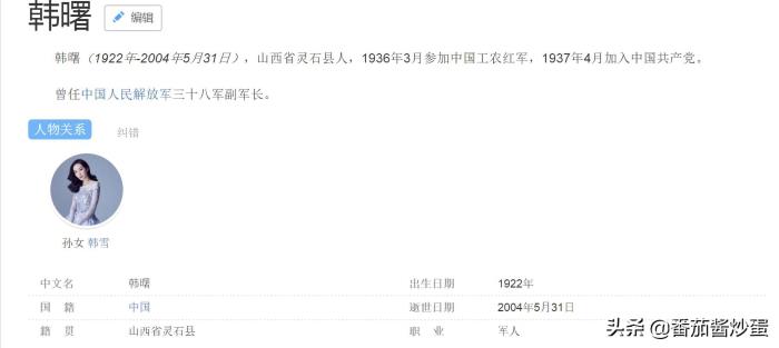 韩雪爷爷韩曙,1955年被授予大校军衔,先后经历的抗日战争,解放战争,抗美援朝。韩雪从爸爸手里继承了代表爷爷光辉的勋章,根正苗红红三代啊。韩雪在访谈节目里透露,演戏初期爷爷让警务员去接送孙女上下班,主要是担心她而不是体现优越感。