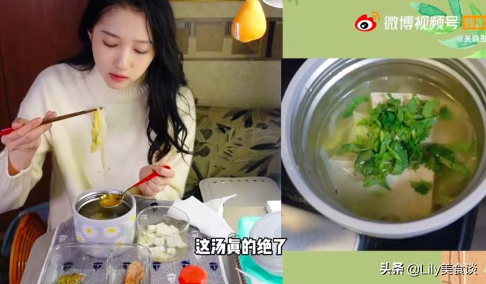 这个白菜豆腐汤也是关晓彤很爱吃的一道营养减肥餐,有菜、有汤还有豆腐,营养好喝热量也不高,关键是做法也非常简单。沸水里放入豆腐、魔芋丝、白菜叶一起煮熟,不用放盐了,调一个葱姜蒜的料汁水蘸着吃,也是非常美味的。香菜的搭配可以提香增进食欲,关晓彤真的非常爱吃香菜。