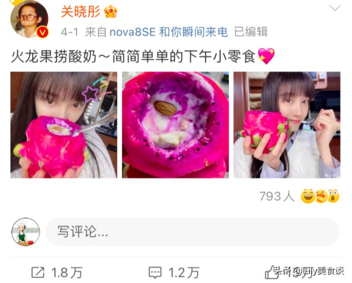 前不久关晓彤在分享自己的春季营养减肥餐时,就有特别提到了自己特别爱吃的小午茶小零食:酸奶红心火龙果。