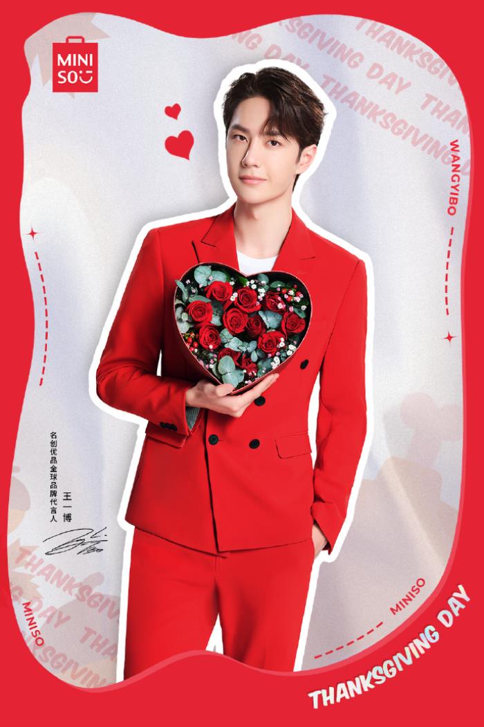 今日,名创优品官方微博释出代言人王一博新鲜物料图,来自啵啵的感恩节祝福,手拿玫瑰礼盒甜度爆棚,所有甜言蜜语只说给你听。
