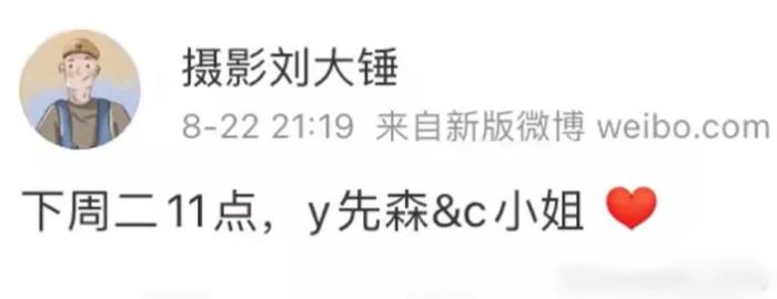 在头几天,摄影刘大锤在社交平台上预言:“下周二11点,y先森&c小姐”,之后,大家开始纷纷猜测这个y先生和c小姐是谁······
