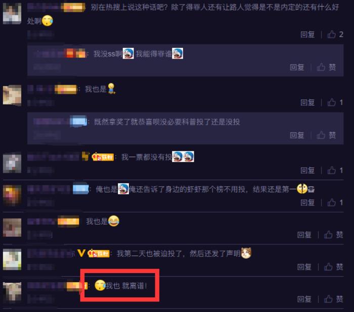 粉丝们对于这个投票结果也纷纷表示离谱,甚至还说自己只投了几票,但是却获得了第一。面对这样的结果粉丝们也非常的焦虑,毕竟之前在微博之夜的投票当中,就有人说微博此次活动有自己的安排,所以放弃了投票。