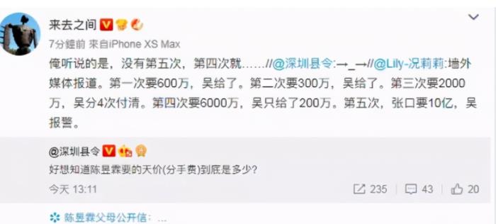 众所周知,吴秀波和陈昱霖闹翻后,以威胁,勒索为由起诉了对方,2019年初事件曝光时,便有人爆料了分手费的相关细节:第一次给了600万,第二次给了300万,第三次给了500万左右,第四次给了200万。