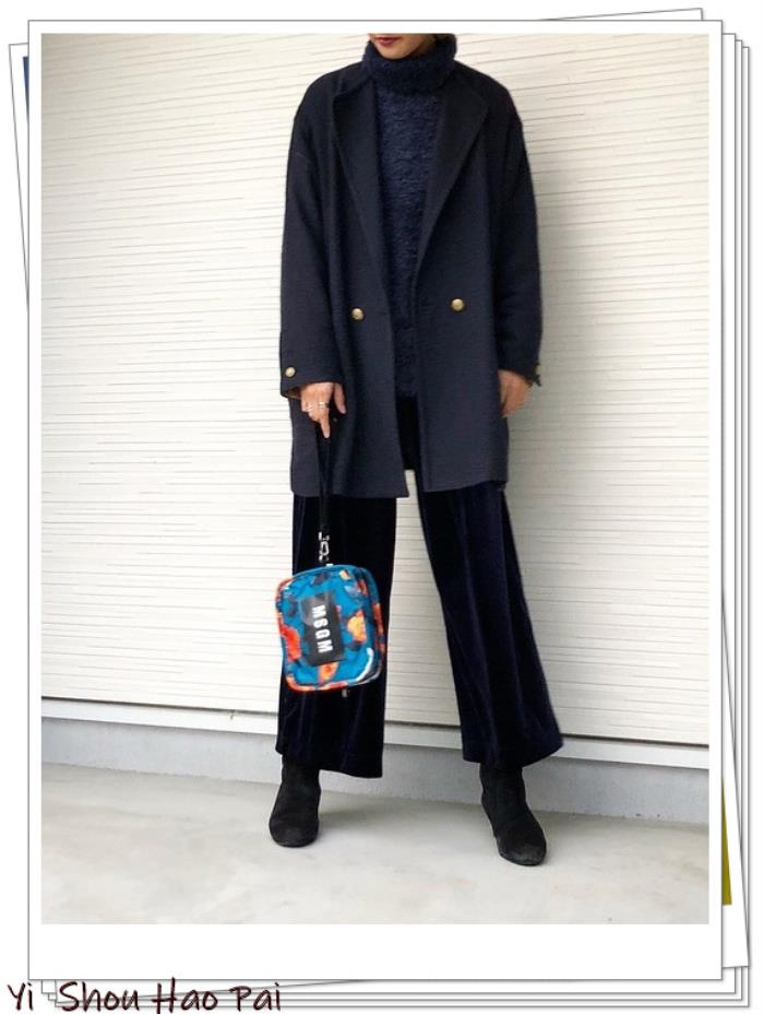 这是一条接近黑色的海军蓝金丝绒裤,宽大的垂坠带来成熟而优雅的外观。内搭高领的针织衫,同时将配有金色纽扣的西装外套也选择海军蓝色,完成单色风格的造型。金色的纽扣显得优雅别致。彩色的包包给造型增添了生动的感觉。