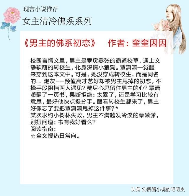 后来整个人变得淡然随性,可以说是被男配虐怕了,不敢再轻易交付自己的真心。这就害惨了男主了。男主被女主迷得七荤八素,女主一个小动作都能把男主撩得神魂颠倒,素来在情场上如鱼得水的男主就这样被女主拉下神坛,从此为女主痴为女主狂。面对事业有成又有生活情趣的天才级男主,动心只是迟早的事。女主虽然对将自己的心藏得很深,但最后还是被男主打动,勇敢地再爱一场。顾大大的书都很棒,没有狗血的剧情,但是一些那么吸引人,清淡下,隐藏这暗流涌动。强烈推荐!5本女主清冷佛系的小说,她淡然从容洒脱,引得雅痞男主动了凡心