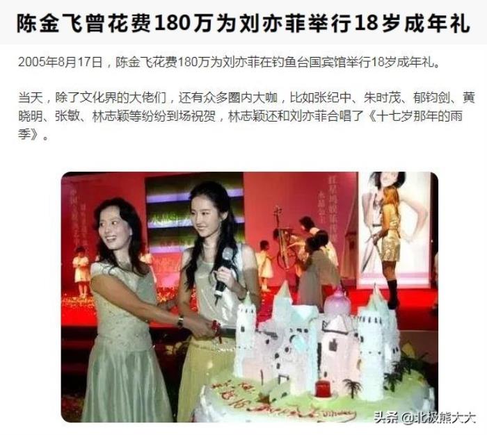 2005年,陈金飞花了180万在北京国宾馆给刘亦菲庆生,还将此次宴会命名为“水晶公主,菲越十八”成人礼。