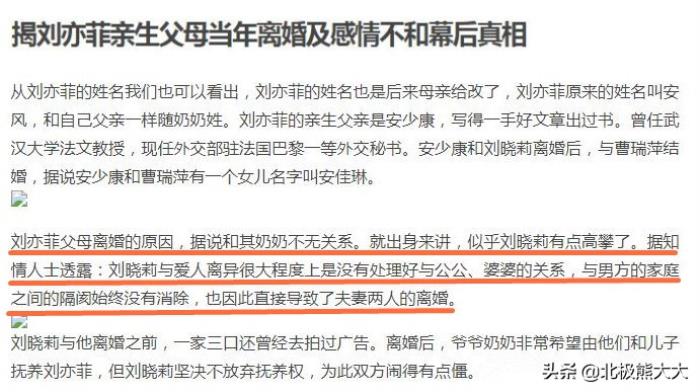 据说之所以会离婚,是因为刘晓莉没有处理好与公公、婆婆的关系,与男方的家庭之间的隔阂始终没有消除,导致婚姻破裂。