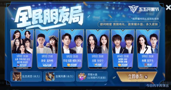 五五开黑节,顾名思义是朋友们一起愉快的玩游戏,活动的特别之处就在于有豁免活动卡,输了比赛不扣分。所以每年的五五开黑节,项目组总会邀请到许多明星一起过来为活动做宣传。
