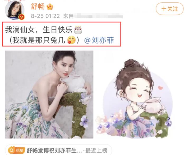 8月25日,演员舒畅在社交平台上更新了一则动态,为好友刘亦菲庆生,并且暖心发文称:“我滴仙女,生日快乐。”