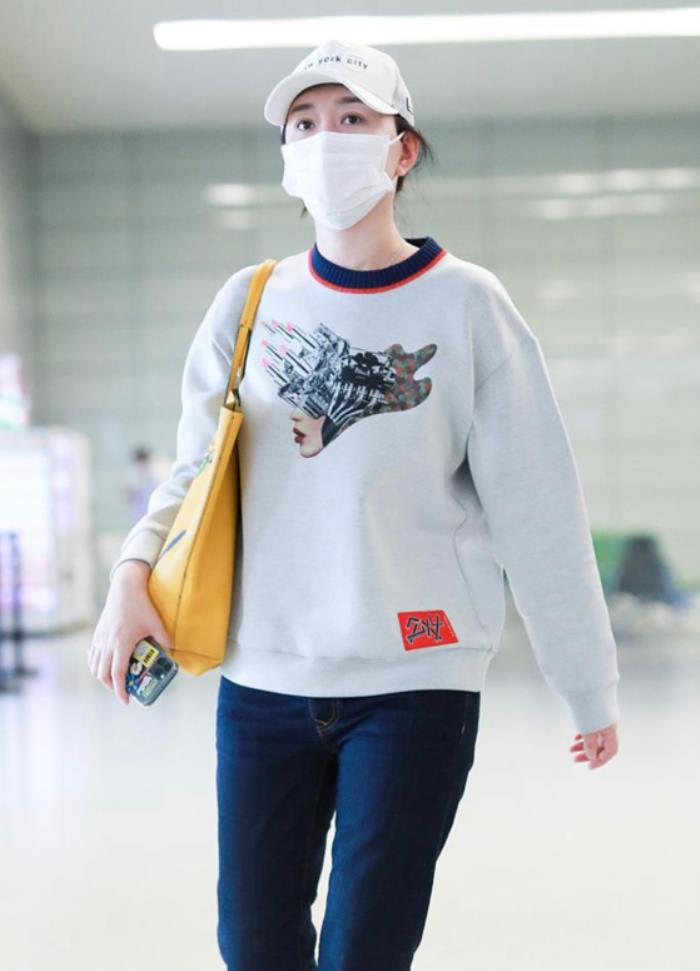 她身穿白色毛衣,搭配深色牛仔裤,选择了白色棒球帽与黄色单肩包,简单又清爽的装扮让她看起来格外年轻有活力。