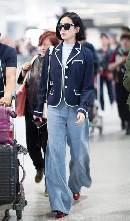 深蓝色绑带西装与裙子的结合也相当妙。对于清冷型女性来说,选择长裙更为合适。如下图中,刘诗诗采用深蓝色绑带西装搭配长款百褶裙,高贵又优雅。长款的百褶裙也显得穿搭者减龄又清新,两者的搭配简直太过融洽了。