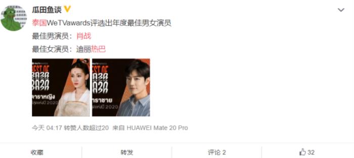 肖战在去年基本上没有什么活动,而且也没有播出的作品,看起来很平平无奇的样子,不过他的人气的确似乎很厉害,最近泰国电视剧的官网放出了肖战得最佳演员的消息,泰国的确有很多人因为《陈情令》喜欢肖战,所以即使肖战有负面舆论,也不阻碍他得到第一。