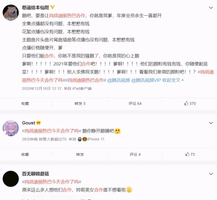 突然就多了一群迪丽热巴和肖战的cp粉,很搞笑的是他们还把“迪丽热巴和肖战今天合作了吗?”这个词条送上了热搜。不得不说,肖战说不定真的在新年和迪丽热巴合作,因为鹅厂现在都在宣传他们,肖战和迪丽热巴的剧一般都是在鹅厂播出,有了赞助商,那么只要一个合适的剧本就能促成他们合作了吧?