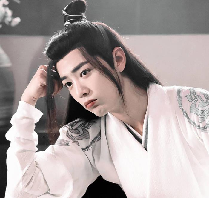 在他被关晓彤扑倒的那一幕里,和肖战在《陈情令》里的造型尤其相似。唯一的不同是肖战的下巴线条更加自然,侯明昊的下巴更尖更突出,乍一眼有些突兀。