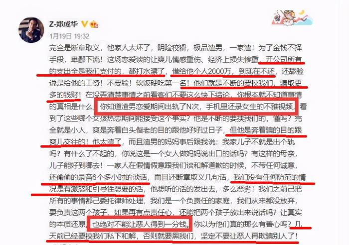 郑成华也同样提到了录音的事情,表示完全是断章取义,还指被张恒一家人要挟。而从抚养权案二审时,郑爽律师拿出聊天记录,张恒曾超过100多次对郑爽说要“打死你”。不过,张恒却以喝醉酒为由搪塞。当然了这样的回答显然是一种狡辩的行为,也难怪张恒会越来越失去“人心”。