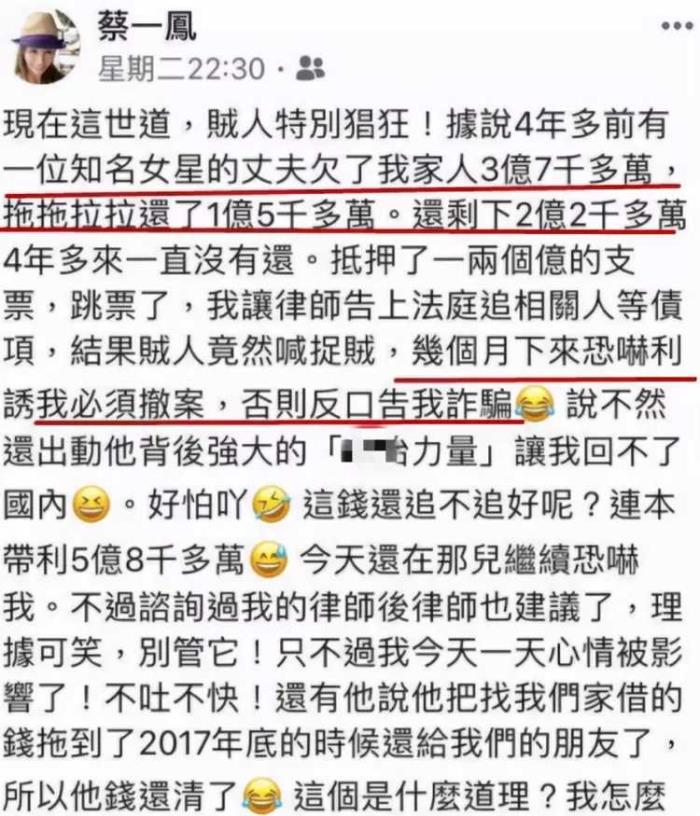 2019年,香港名媛蔡一风微博吐槽知名女星丈夫,拖欠她家2亿2千多万的债款。虽说蔡一凤没有指名道姓的说欠钱是谁,但后来在法庭文件中可以发现黄有龙的名字出现在第二被告的位置。