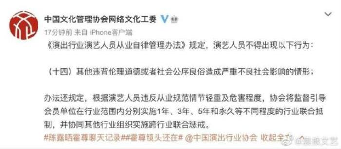 中国文化管理协会网络文化工委则就这一事件发文称,《演出行业演艺人员从业自律管理办法》规定,演艺人员不得出现以下行为:(十四)其他违背伦理道德或者社会公序良俗造成严重不良社会影响的情形。《办法》还规定,根据演艺人员违反从业规范情节轻重及危害程度,协会将监督引导会员单位在行业范围内分别实施1年、3年、5年和永久等不同程度的行业联合抵制,并协同其他行业组织实施跨行业联合惩戒。