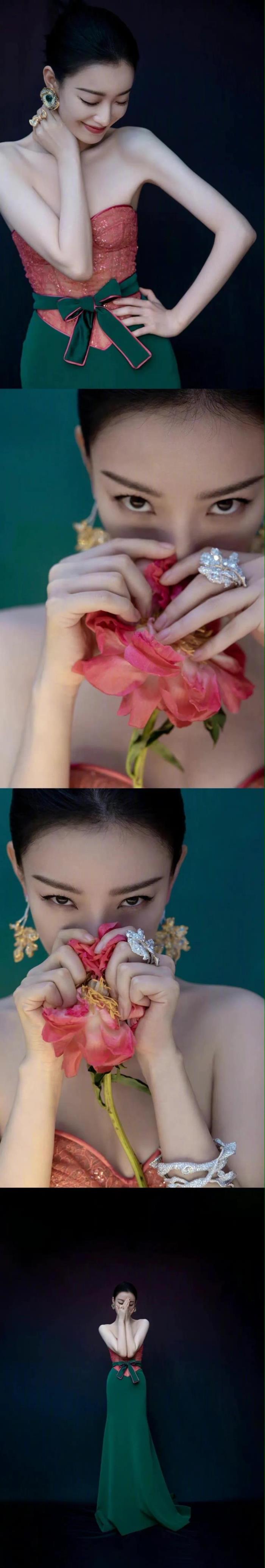 粉色的抹胸配绿裙子,按说放在别人身上驾驭不好肯定很灾难,但是在倪妮身上真的毫无悬念的美,跟配饰融为一体的配色,看上去优雅大气又非常有艺术感。