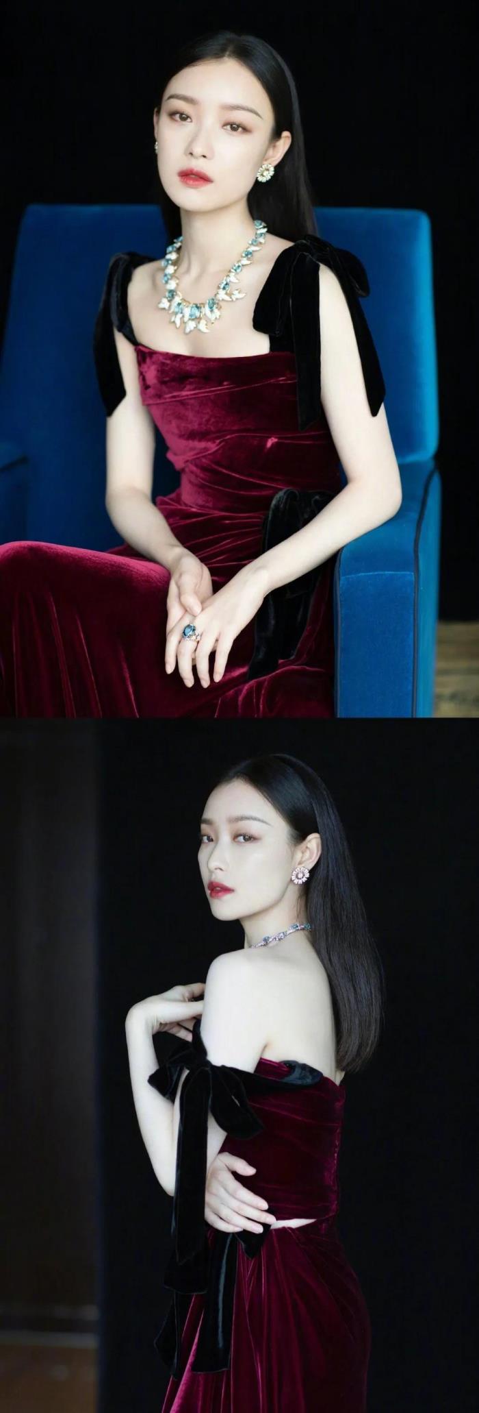 这条丝绒裙配上黑长直的造型出得更早,整个人看起来十分温柔古典,眉眼间带着笑意,仿佛有话要对你说。