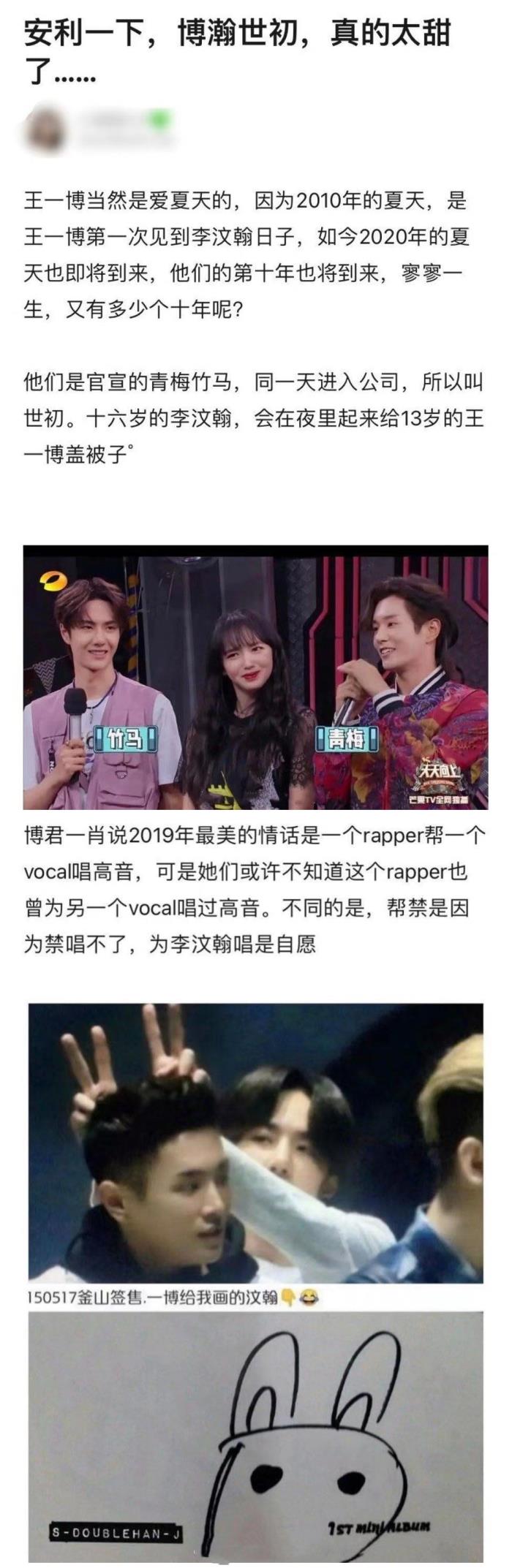 2019年4月6日,李汶翰参加《青春有你》获得冠军重新出道,他比王一博的流量高了。4个月过后,《陈情令》播出,王一博成为顶级流量,重新又反超了李汶翰。他们不红的时候,感情很好;红了以后,反而有很多包袱了。