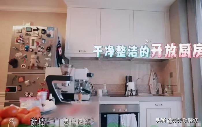 她家的厨房设计为开放式厨房,与餐厅成为一体。厨房采用了全白的简约风格,看起来非常斯文清新。吊柜与橱柜都是统一色系套装设计,非常的耐看!看来周笔畅很少住房,家里也只有咖啡机,水果,烤箱,饮水机等小物品,其他的日常煮饭厨具倒是没有看见!不过对于她来说,这也是很有仪式感很能让她放松的地方。这里最明显的就是冰箱,上面贴满了各种冰箱贴,非常懂得点缀,把生活中的热情都放在冰箱上,充满了生活的气息!