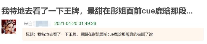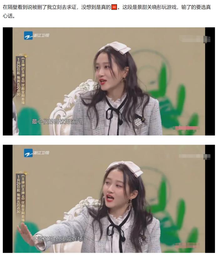 到了《王牌》的正片中玩游戏的这段,景甜回答的鹿晗片段确实被删减了,只留下了张彬彬和陈晓两位。而且,关晓彤还疑似后期重新配音了。