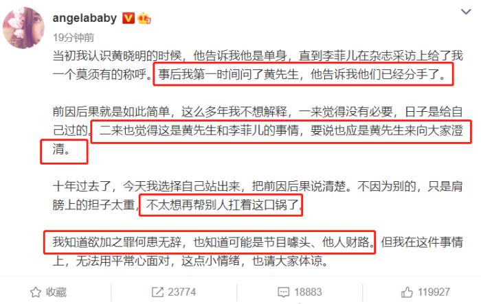 baby在微博中澄清自己并不是小三,李菲儿在杂志中直接用这种莫须有的罪名称呼自己之后,她在第一时间询问了黄晓明,黄晓明也表示二人早已离婚,随后,黄晓明也在微博发声明,为baby澄清,但是二人的声明对彼此的称呼稍微有些生疏。