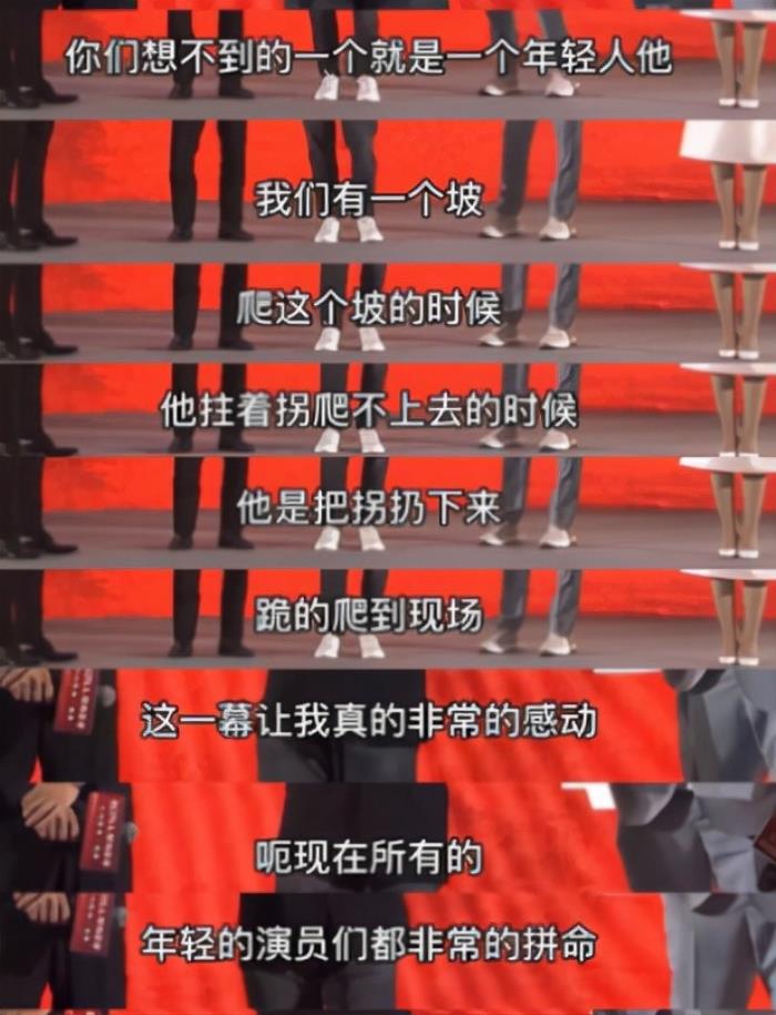 当时需要走站位,他拿着拐杖爬不上去,就索性把拐杖扔下,抛弃偶像包袱,连跪带爬来到拍摄现场的走位上,这一幕让剧组里的几个前辈为之动容。