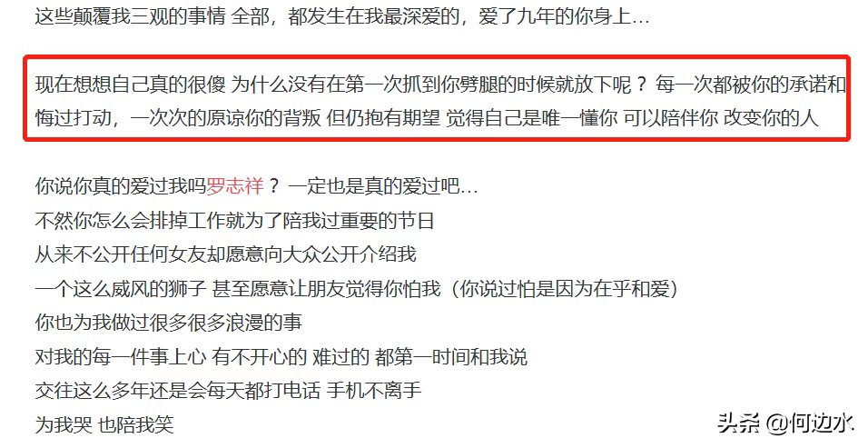 至于微博的内容就不多叙述了,简单归纳为:1.两人彼此深爱;2.分手起因是周扬青看了罗志祥的手机;