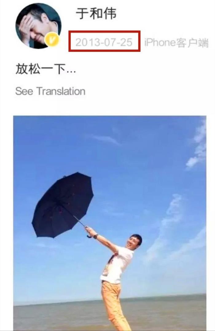 2013年7月25日,于和伟发微博:放松一下,并配图撑伞照片。