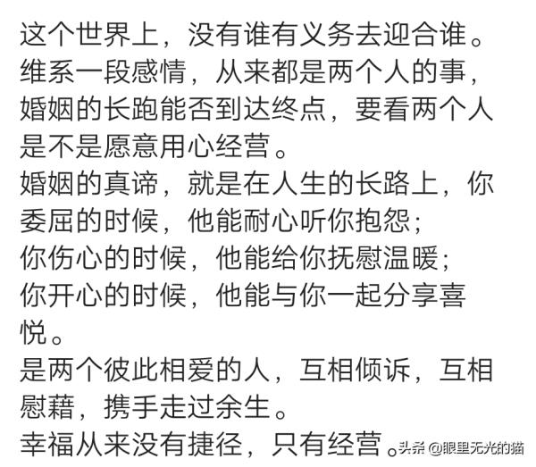 我的婚姻,一年365天,300天都在冷战,剩下的在吵架,或者不在家。年轻的时候还想着多沟通,多理解,多体谅,多包容。期待总有一天那个人脾气会变好,会爱孩子爱这个家。结果从20岁等到30岁,等到40岁,直奔50了。终于明白,你永远暖不热一颗不爱你的心,你也永远叫不醒一个装睡的人。就这样吧,期待孩子长大,那个人,就当死了。