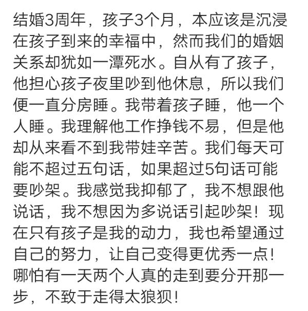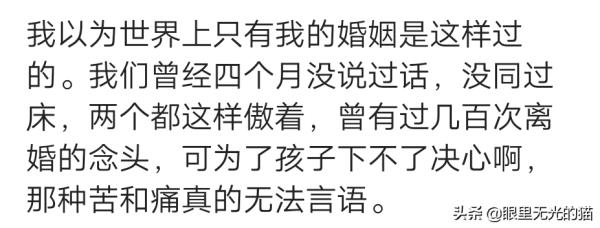 大肚子就分床睡,已经21年了。感情,感情是一个什么东西啊?忘记了。不说话,陌生人,挣钱多少,不知道,出门了,不知道他干嘛去了?不能问,不能打电话☎️。不能离婚,因为,有一对双胞胎儿子。为了两个双胞胎儿子。忍着,憋着,熬着!自己坚强,坚强,再坚强。反正没有死掉,还在努力地活着。不过,收获了两个双胞胎儿子的爱,我可以在两个双胞胎儿子怀里撒娇,两个双胞胎儿子把我当小女孩对待。人生足矣!
