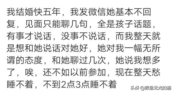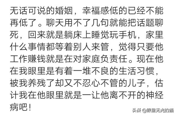 结婚7年,连眼神都不需要交流,彼此早已习惯相对无言,连尴尬的感觉都没有。也没有离婚的想法,因为彼此都不觉得有什么问题。都有各自的圈子,忙于工作忙于琐事,相安无事地过着吧。