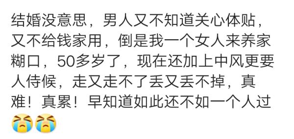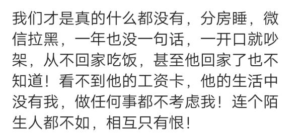 世界上什么家庭都有,家家有本难念的经,总的来说是女人的悲哀,我老公是受原生家庭影响的。从无话不谈到无话可说,分房睡经济独立,一分钱都不给这个家,孩子们的教育也不闻不问,很难熬。