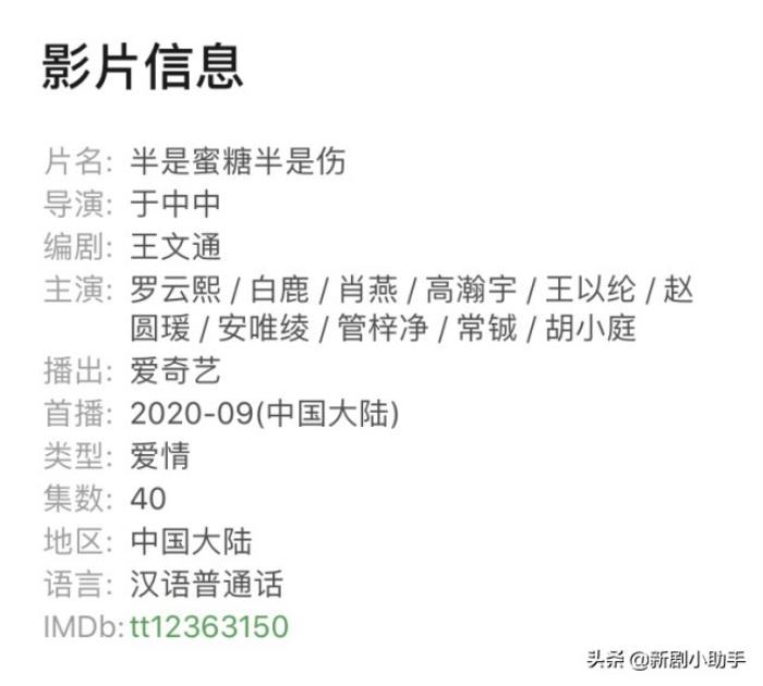 《半是蜜糖半是伤》改编自同名小说,由罗云熙、白鹿、肖燕领衔主演。主要讲述了患有重度眼泪过敏症的江君(白鹿 饰演)多年后重遇青梅竹马袁帅(罗云熙 饰演)的故事。