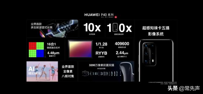 华为消费者业务CEO余承东在发布会上表示:“每一代华为P系列手机,都引领了智能手机的摄影创新,也同时树立了智能手机摄影的新标杆。四年前华为和徕卡启动合作,华为P9是当时全球首款在旗舰智能手机中使用徕卡双摄的智能手机,并把移动摄影带到了新的高度。两年前,我们首次在P20手机上应用人工智能摄影技术,用AI识别场景,为消费者自动发现场景,只需按下快门就可以获得有质感的大片。同时引入了大底传感器,使得智能手机的暗光拍摄能力迈上了新的台阶。去年,华为P30 Pro率先引入五倍光学变焦,把我们的长焦能力提升到新境界。同时,新一代的超感光大底传感器使得暗光能力更进一步。今天,2020年4月8日,华为P40系列在中国上市,为消费者带来超感知的影像、超感知的体验和超感知的性能!”