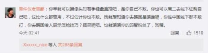 你早就可以摄像头对着手键盘直播吧,是你自己不敢。你也可以周二去线下证明自己吧,这比什么都管用,不过估计你也不敢。我就想知道你去韩国是骗谁呢,你连中国线下都不敢打,你去韩国给人展示压枪技巧?搞笑呢吧。也就骗骗你的弱智粉丝了,戏精。