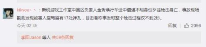 新锐游戏工作室中国区负责人金秀焕行车途中遭遇不明身份歹徒枪击身亡,事故现场勘测发现被害人座驾留有17处弹孔,目击者称事发时整个枪击过程仅不到2秒。