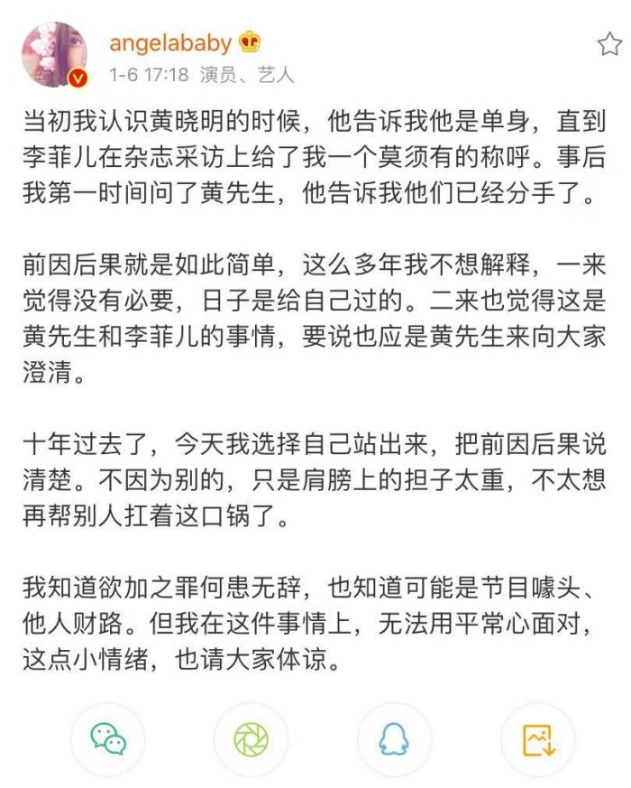 杨颖发文澄清,当时和黄晓明恋爱,结果李菲儿接受杂志采访的时候貌似认为对方插足自己和黄晓明的恋情,而黄晓明的回应是已经分了。杨颖称呼黄晓明为黄先生,并不是晓明哥,也不是用老公,看来两人难道真的分了?杨颖说这事已经是十年前的事,自己选择站出来说,只是肩上的担子太重,不太想再帮别人扛这口锅,别人是指黄晓明吗?