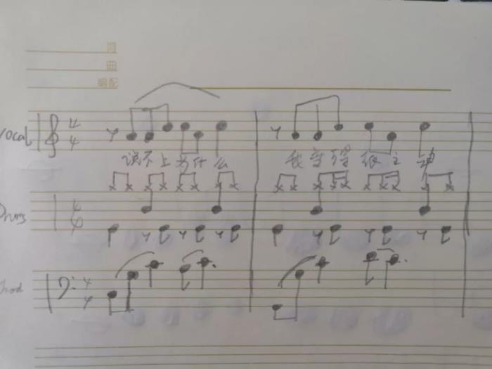“说不上为什么,我变得很主动”,这段旋律是“661161,661161”,你看,他的旋律其实非常简单,而且有很多的同音重复,从旋律线条写作上来说,这个和传统中文流行音乐是离经叛道的。这时候,我们就不能只听旋律,我们得把歌曲视作一个整体,我们要去听它的歌曲呈现。我把这两小节的谱写在这里,我写了三轨,零乐理你也能听到的三轨,分别是周杰伦的人声(vocal),鼓(drums),还有吉他一轨(从功能上,我标了chord)。