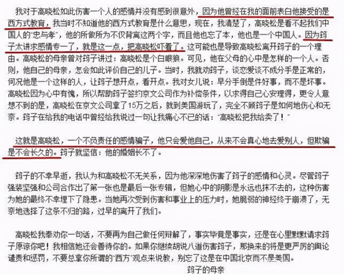 虽然后来媒体致歉采访错了人,撤销了文章,但筠子的妈妈看到媒体曝出高晓松不负责任的言论后,愤怒地给《音乐生活报》发文,控诉高晓松的忘恩负义与背信弃义。