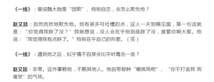 同时,赵又廷还顺带谈起了和魏大勋的相处方式,表示魏大勋特别喜欢问别人:“你觉得我胖了没?”这也让人忍不住的想要去“嘲讽”、“打击”他。