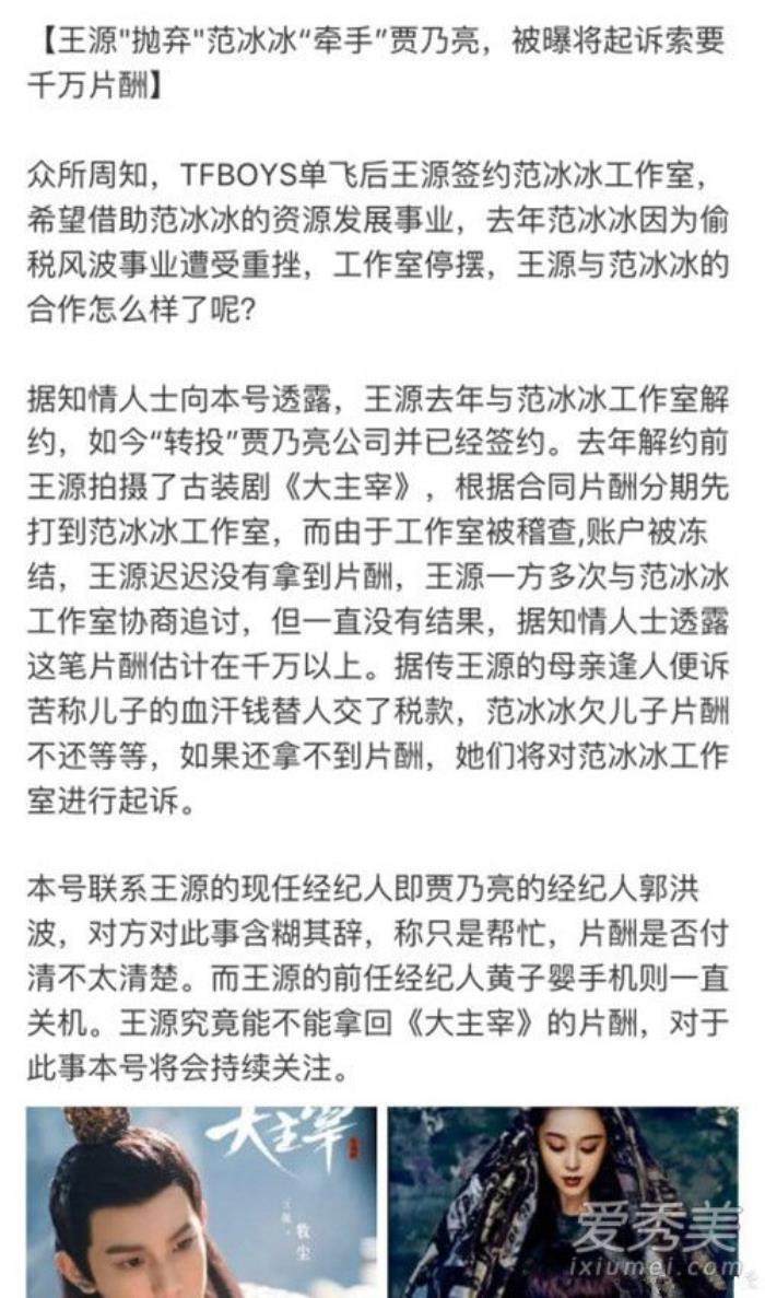 王源与范冰冰解约是因为片酬吗