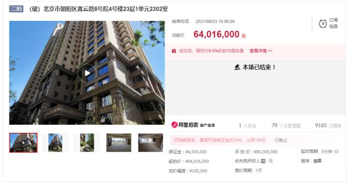 此前的7月12日到7月13日第一次拍卖流标,此次拍卖降价20%成交。