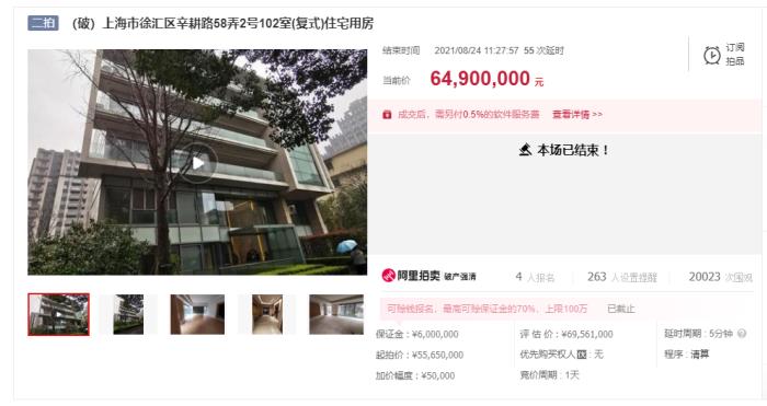 上游新闻记者还获悉, 今年8月23日至8月24日,淘宝网司法拍卖网络平台,对上海市徐汇区辛耕路58弄2号102室(复式)住宅用房进行公开拍卖,起拍价5565万元,4买家入场,经过56次竞价, 55次延时,最终以6490万元,按照建筑面积705.61平方米,折合每平方米9.20万元,也为叶简明旗下企业所有。