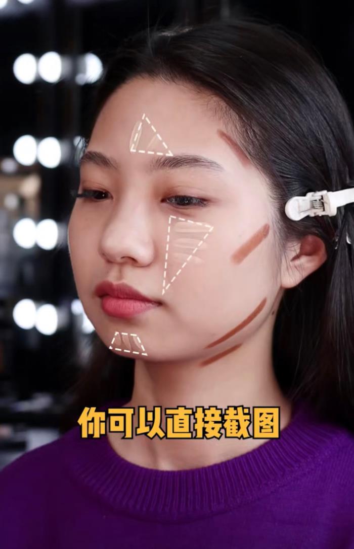 首先,修容的同时要伴随提亮。提亮时,额头以三角形晕染开;眼下呈长倒三角形,拉长中庭;下巴提亮走势应往下拉,会有让下巴变尖的效果。